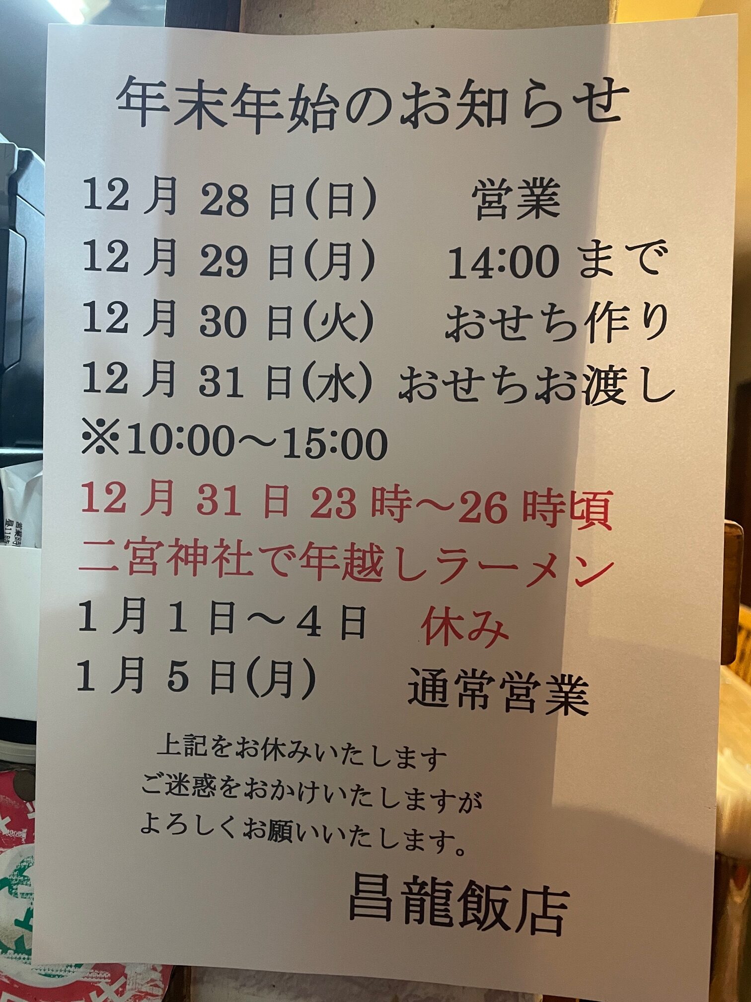 いつも 昌龍飯店 をご利用いただき、誠にありがとうございます。